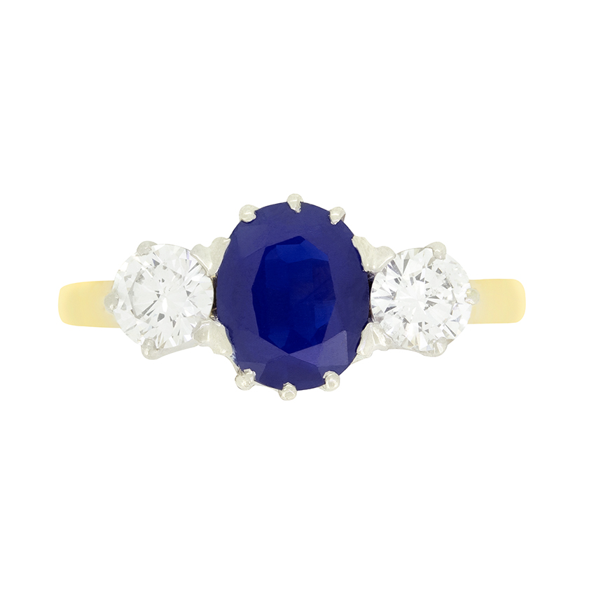 Vintage 1.30ct Sapphire and Diamond Three Stone Ring, c.1950s
